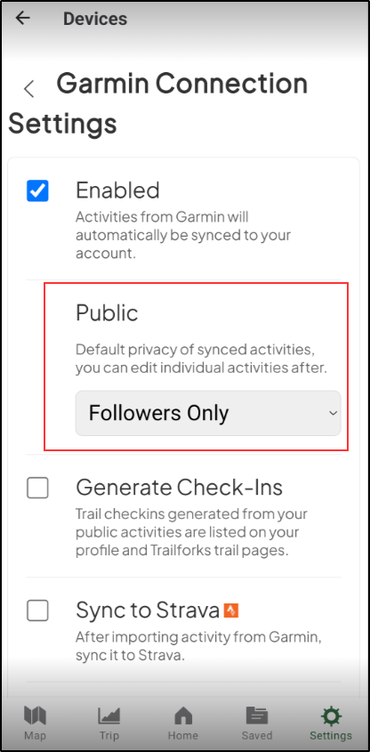 Under your synced device settings (example: Garmin below), you will have the option to change the privacy of your synced activities. If you have enabled 'Followers' or 'Everyone' to see your synced activities, these tracks will publish to the feed.