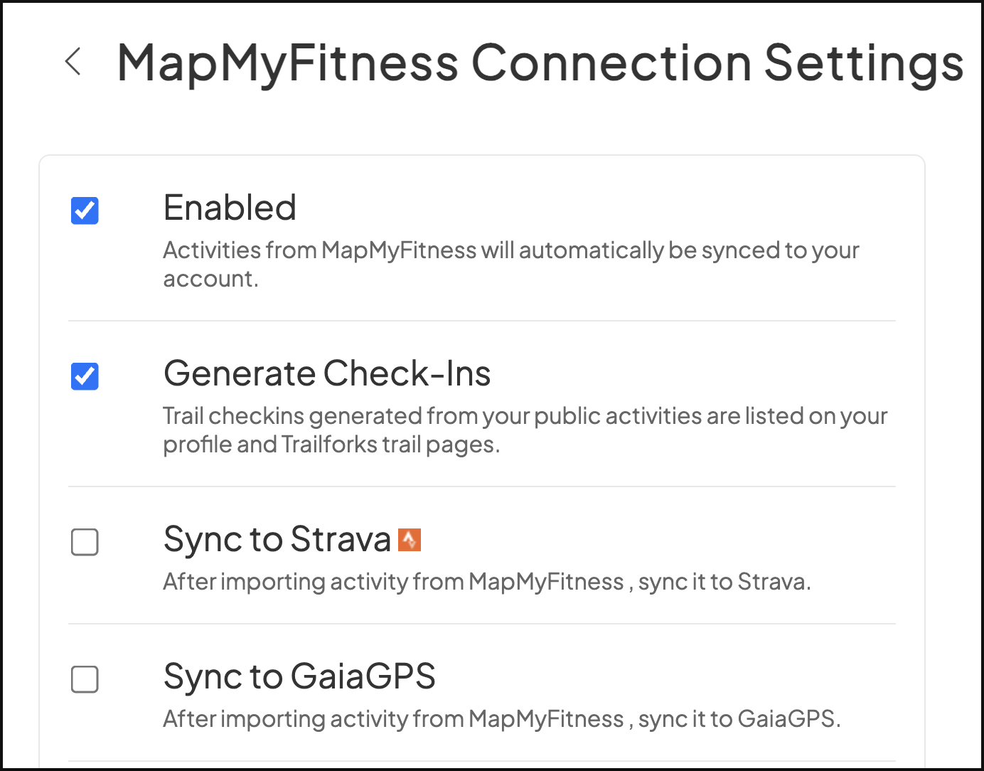 For MapMyFitness activities, only activities that have set GPS tracks will be uploaded to Trailforks and/or Gaia GPS. If you record a gym workout or yoga class, for instance, on your MapMyFitness account, these activities will not be imported to Trailforks or Gaia GPS.